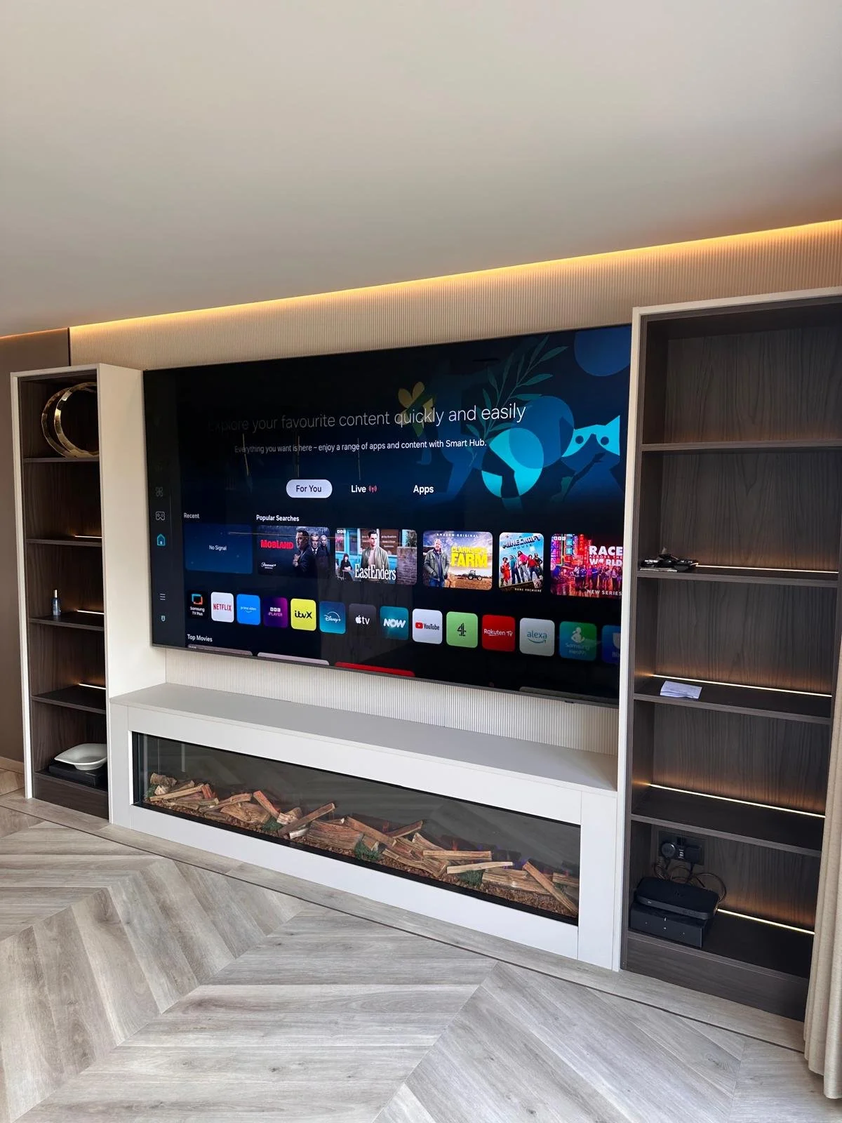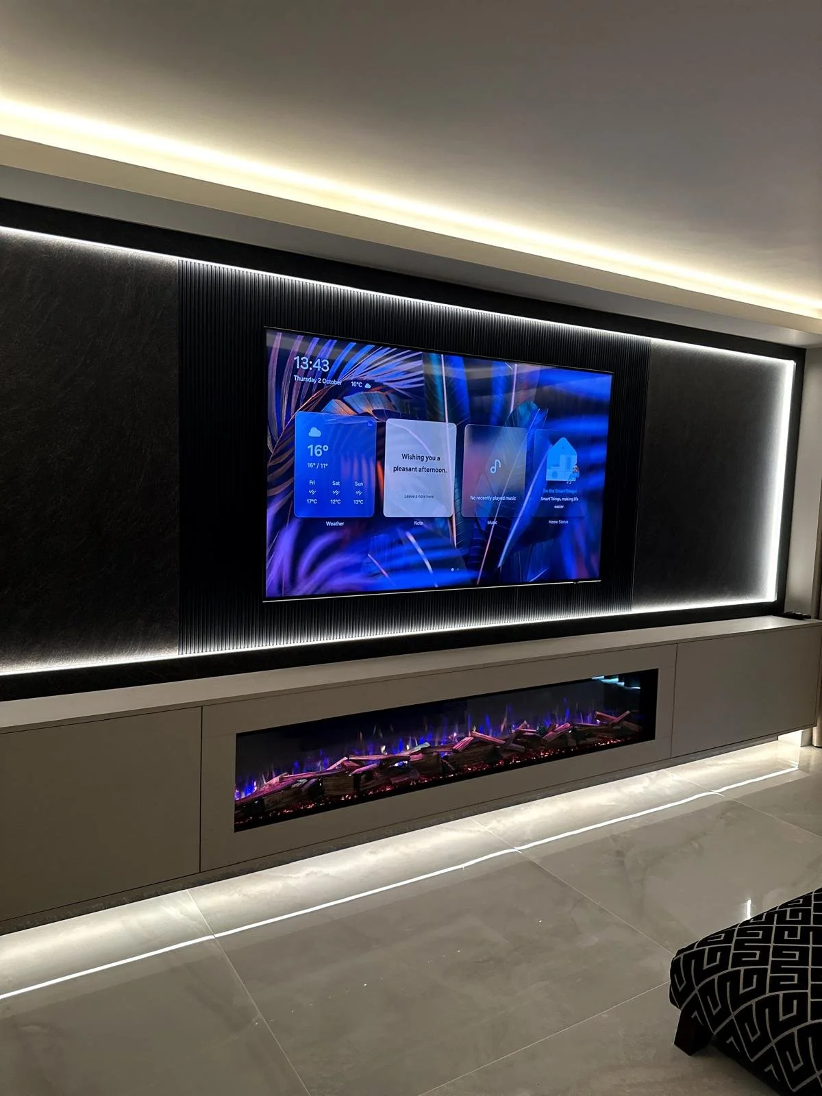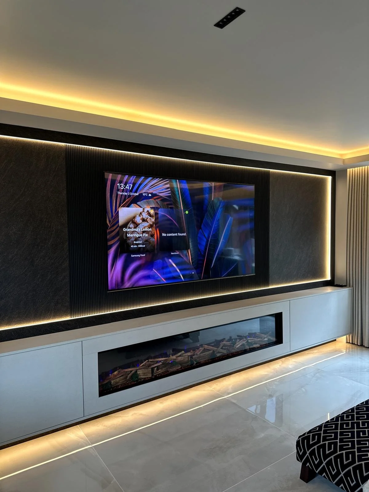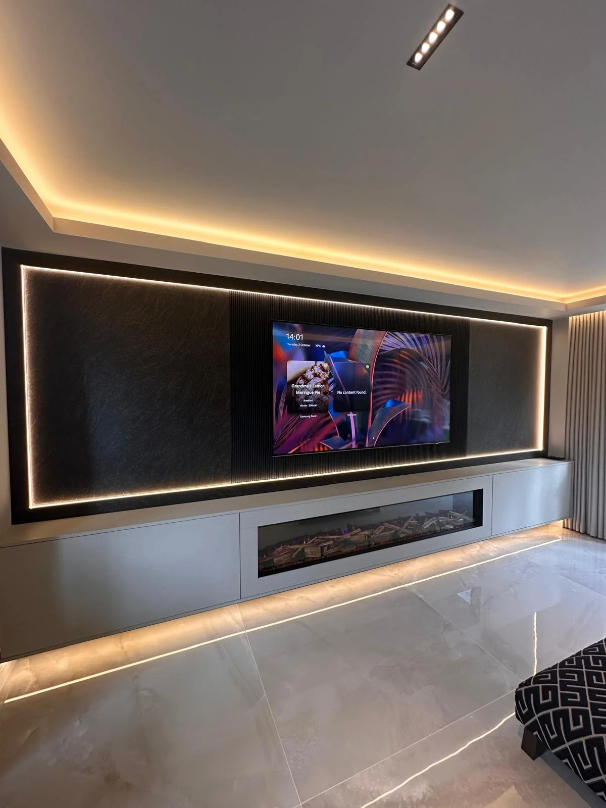 Each project is designed with precision — integrating TV units, ambient lighting, and electric fireplaces for a seamless and stylish focal point.