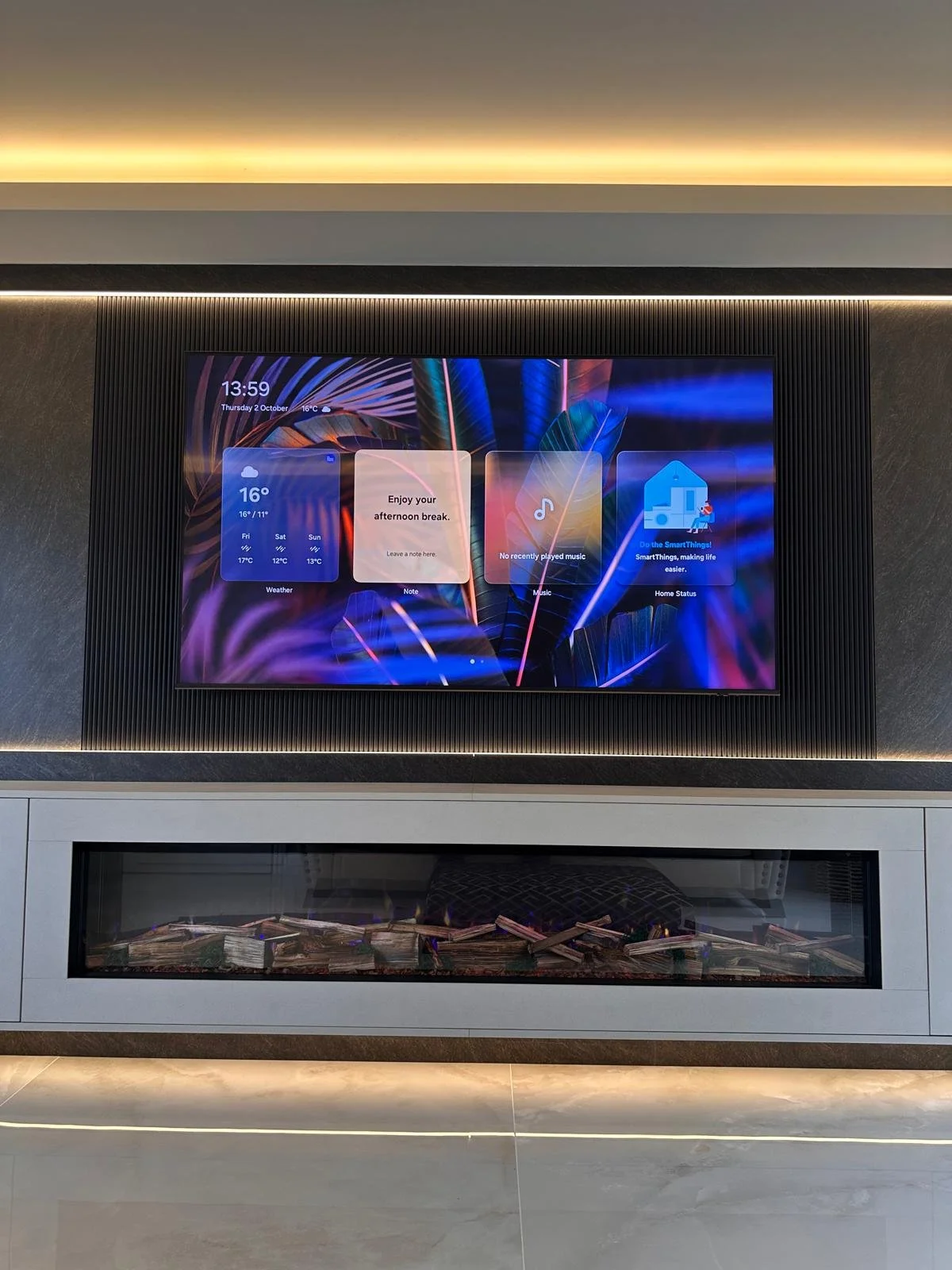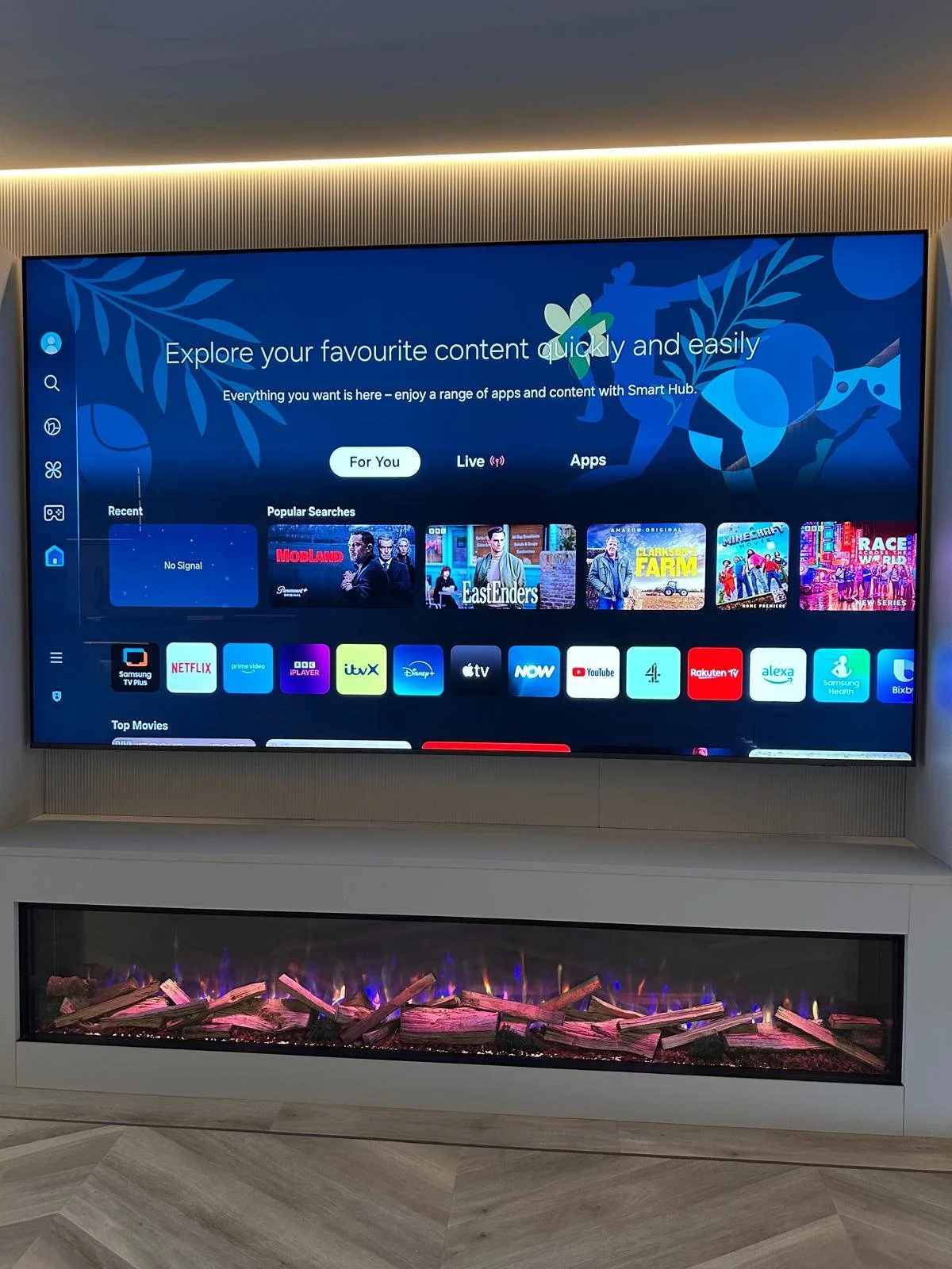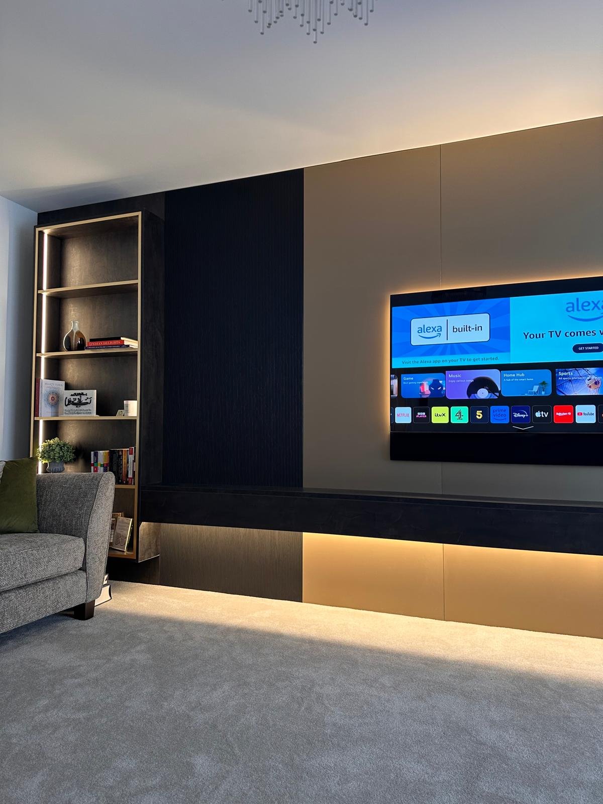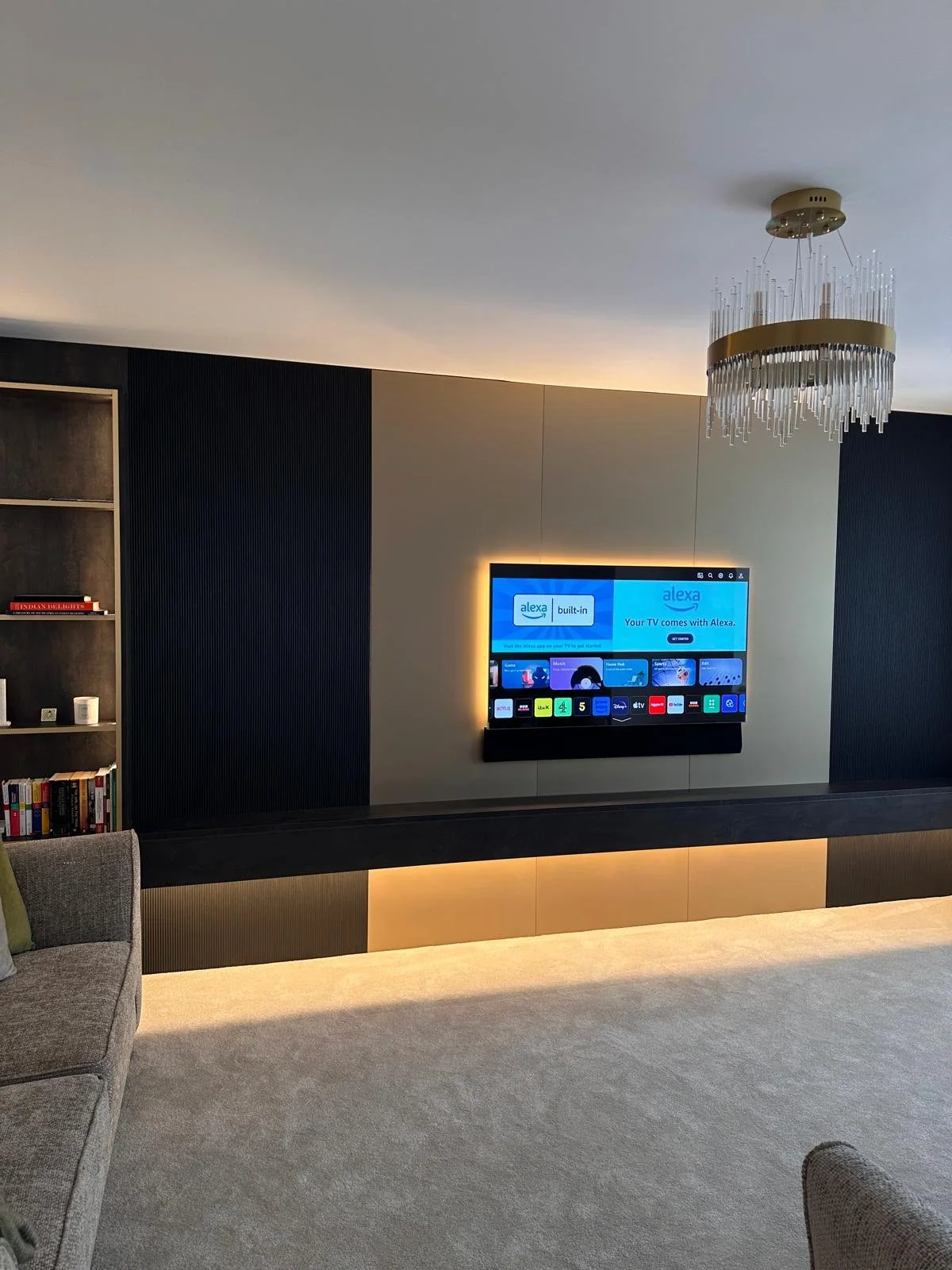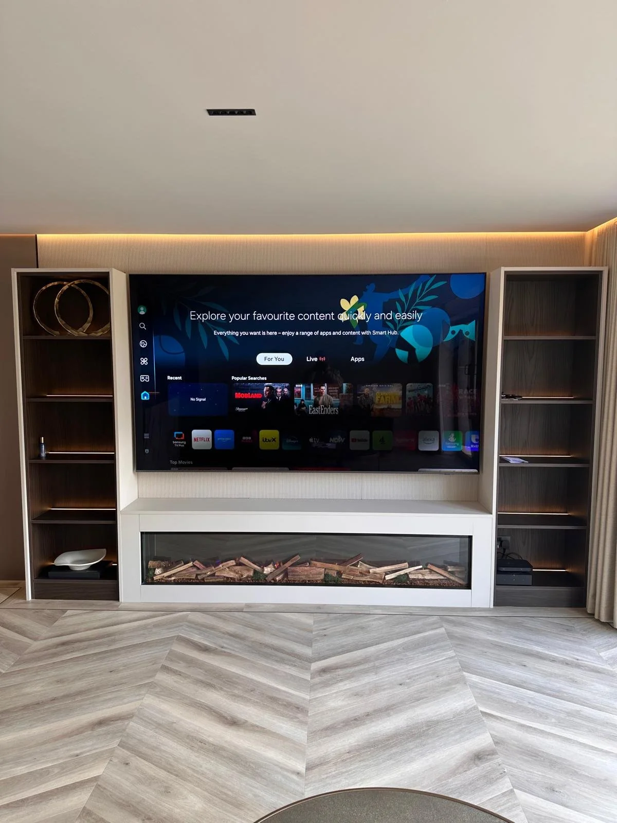 Each project is designed with precision — integrating TV units, ambient lighting, and electric fireplaces for a seamless and stylish focal point.